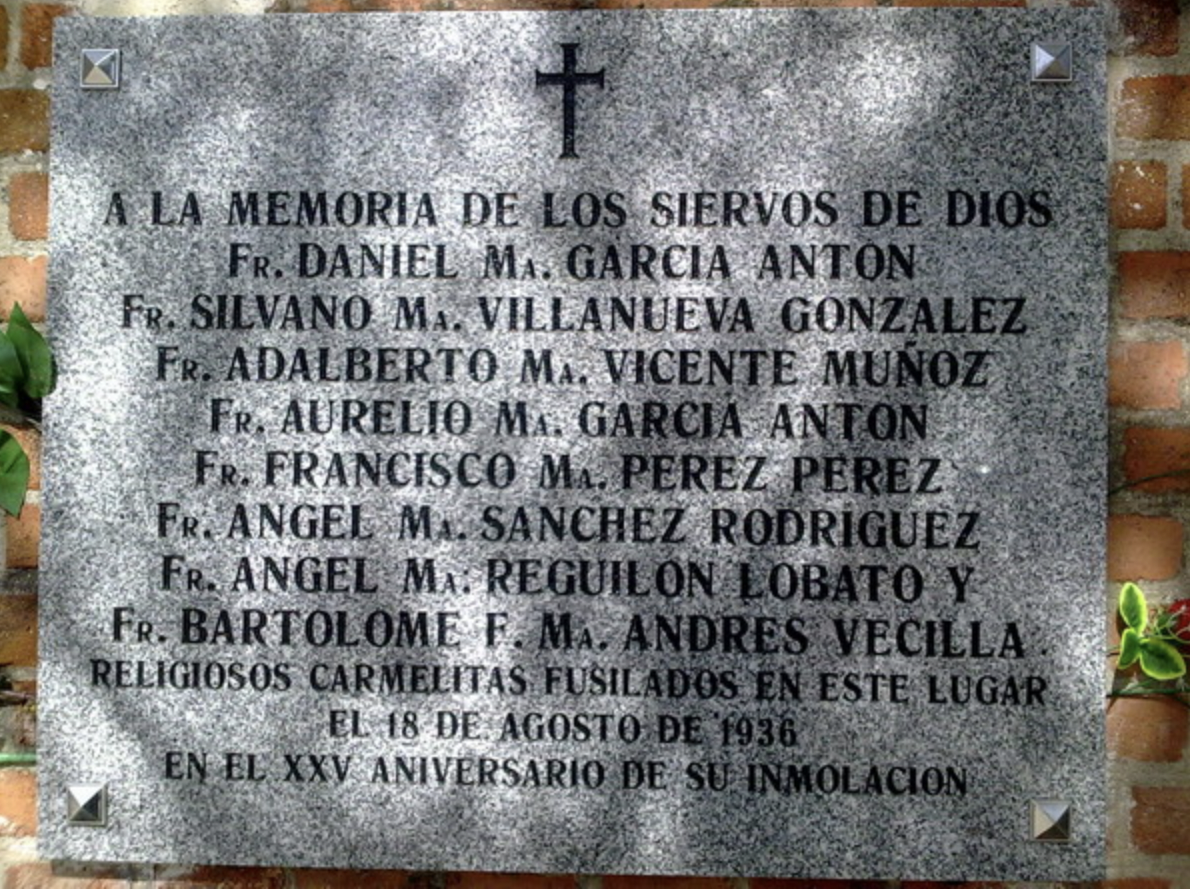 “A la memoria de los siervos de Dios: Fr. Daniel Mª García Antón, Fr. Silvano Mª Villanueva González, Fr. Adalberto Mª Vicente Muñoz, Fr. Aurelio Mª García Antón, Fr. Francisco Mª Pérez Pérez, Fr. Ángel Mª Sánchez Rodríguez, Fr. Ángel Mª Reguilón Lobato y Fr. Bartolomé F. Mª Andrés Vecilla, religiosos carmelitas fusilados en este lugar el 18 de agosto de 1936. En el XXV aniversario de su inmolación”.