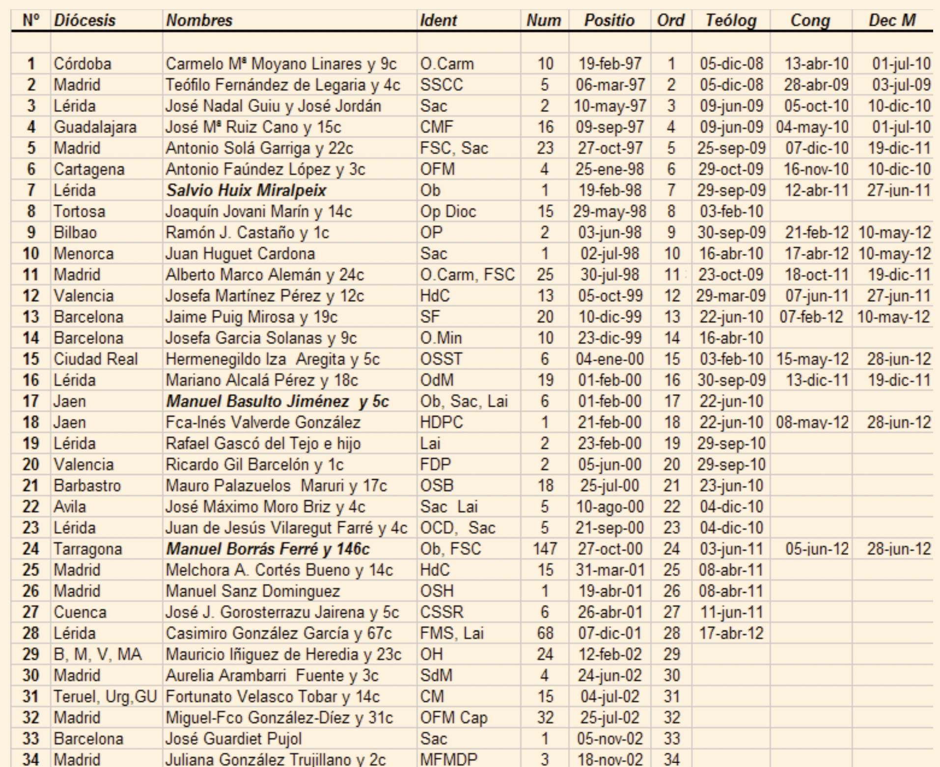 La relación individualizada y los datos de cada uno de los mártires que comprenden estas 34 causas puede verse en Internet en nuestra página web: http://www.hispaniamartyr.org