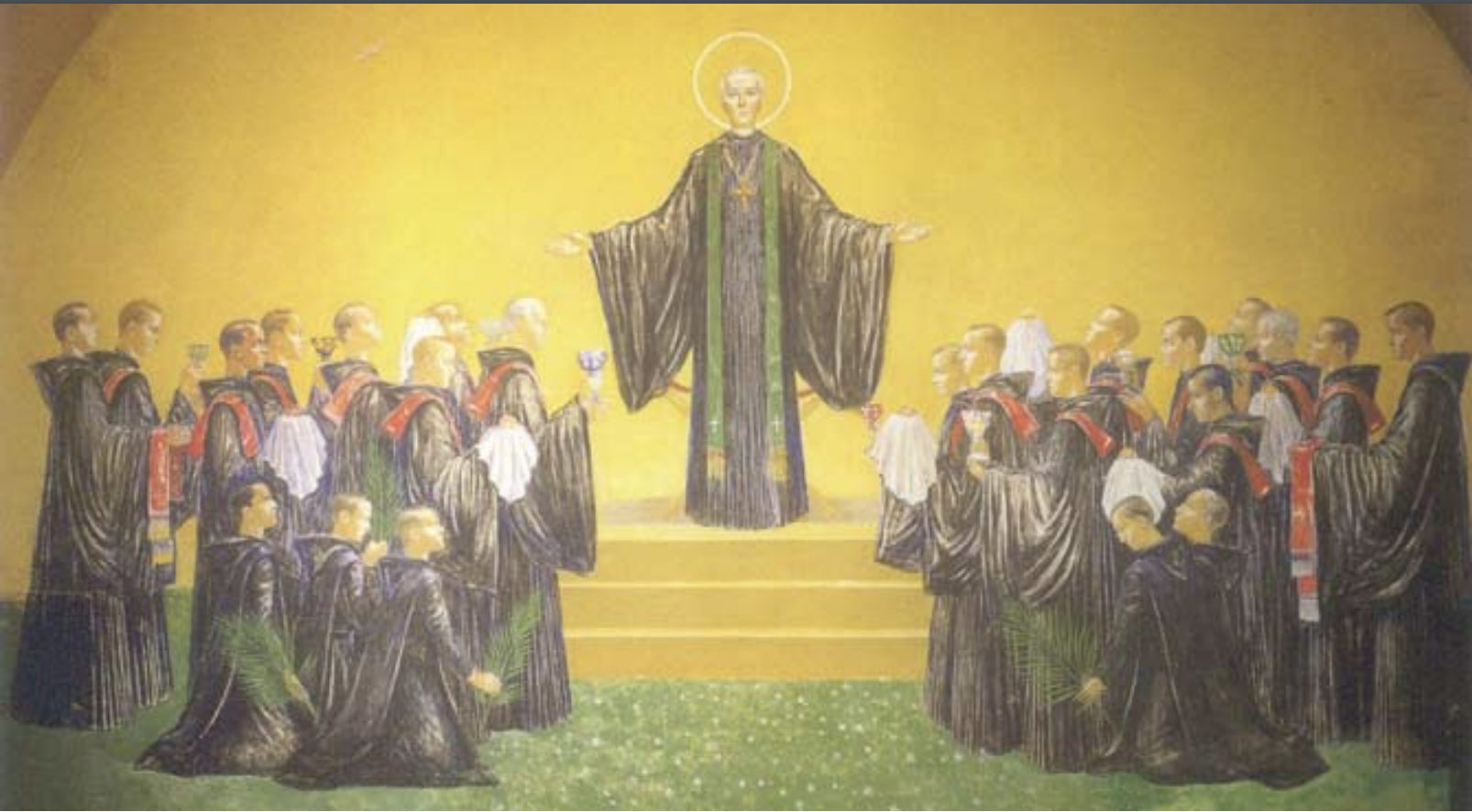 Pintura mural de Pere Pruna San Benito recibe el homenaje de los 23 monjes benedictinos mártires de Montserrat en 1936, que preside la Sala Capitular de su Monasterio, en la que los futuros Beatos Mártires ofrecen su sacrificio ante su Padre San Benito.