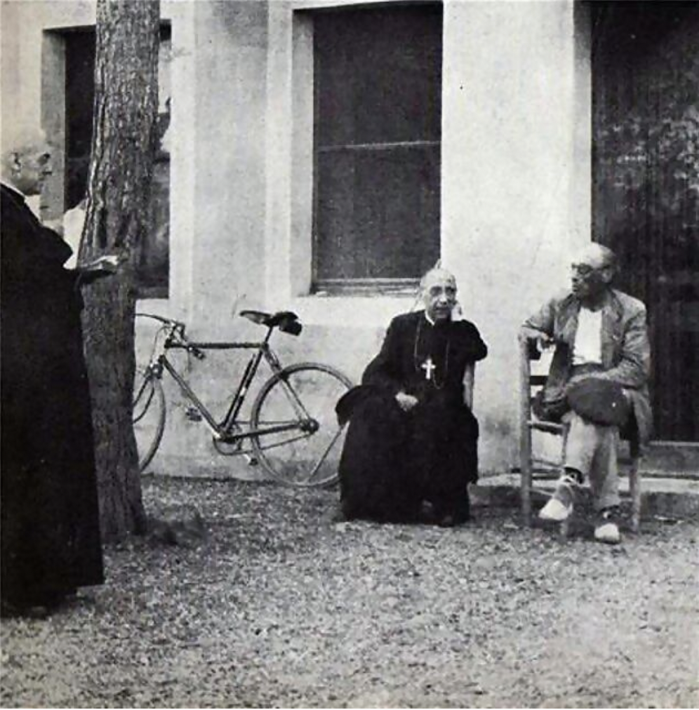 El Cardenal Vidal i Barraquer en un momento de apacible convivencia familiar. El labriego que está sentado con él es su hermano. De pie, su auxiliar en Tarragona, el Siervo de Dios Manuel Borrás.