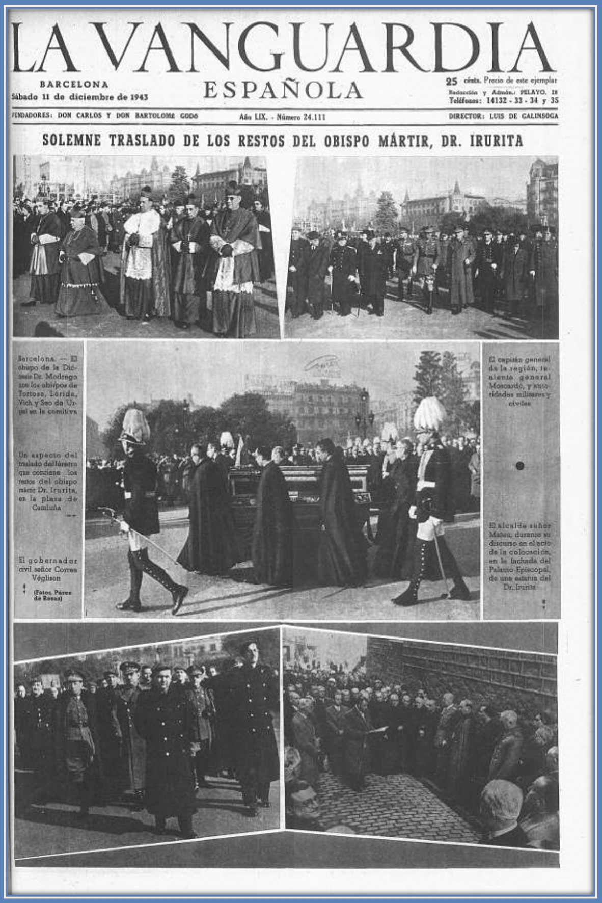 Os dejo las portadas de “La Vanguardia Española” de los días 10 y 11 de diciembre de 1943. Cuando tras recuperar el cuerpo del Siervo de Dios Manuel Irurita Almandoz se le enterró en la Capilla del Cristo de Lepanto de la Catedral de Barcelona.