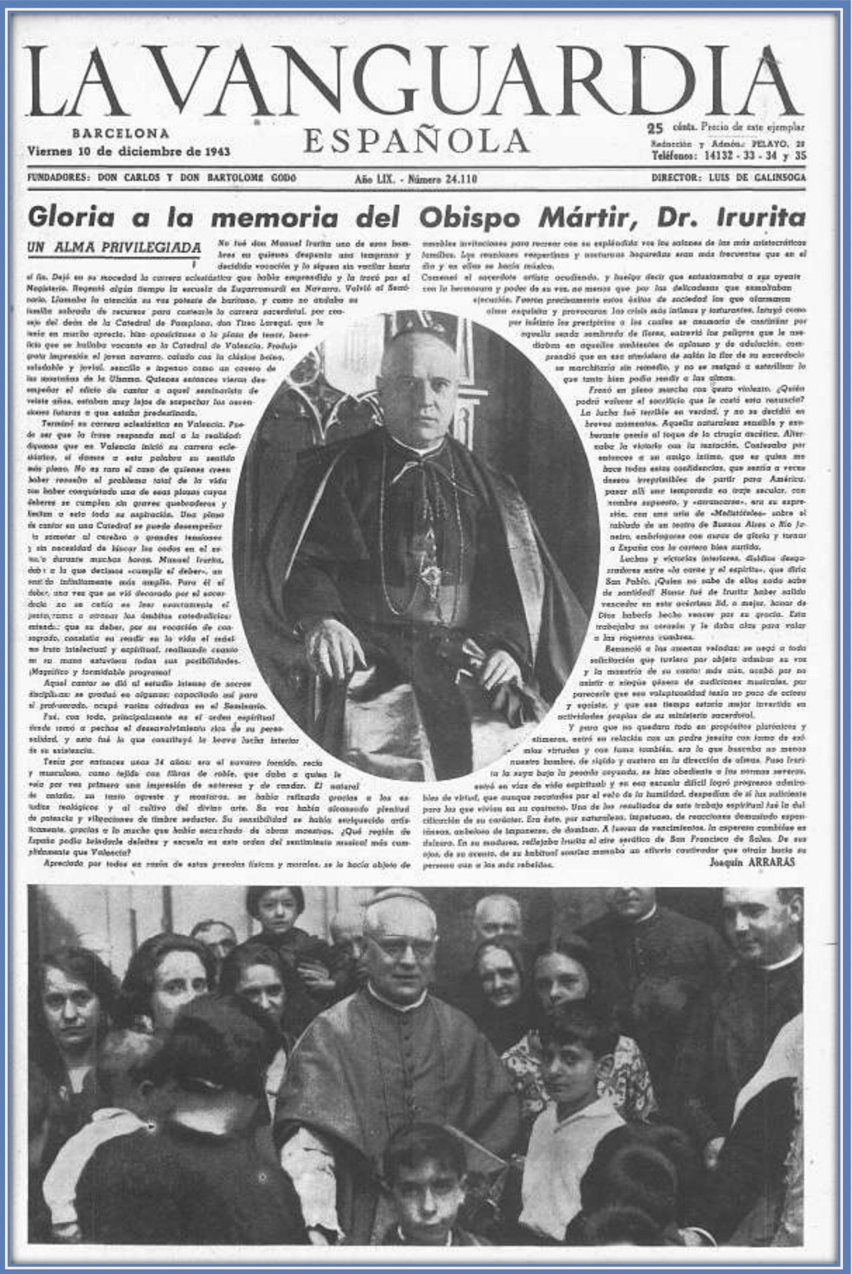 “Hoy celebra su fiesta onomástica nuestro bondadoso prelado doctor Manuel Irurita Almandoz, quien durante el breve tiempo que ejerce su pontificado en esta diócesis, ha sabido conquistar muchos afectos con su inagotable caridad y muchas almas con su palabra persuasiva y con el ejemplo de sus preclaras virtudes. Pastor prudente y comprensivo, a todos llegan los efluvios de su corazón nacido para el bien y para el amor que a todos nos iguala ante la grandeza infinita del Creador de todas las cosas. La divisa del doctor Irurita parece ser la de sumar voluntades para difundir cada vez más las enseñanzas de la Iglesia en todos los sectores de su rebaño.