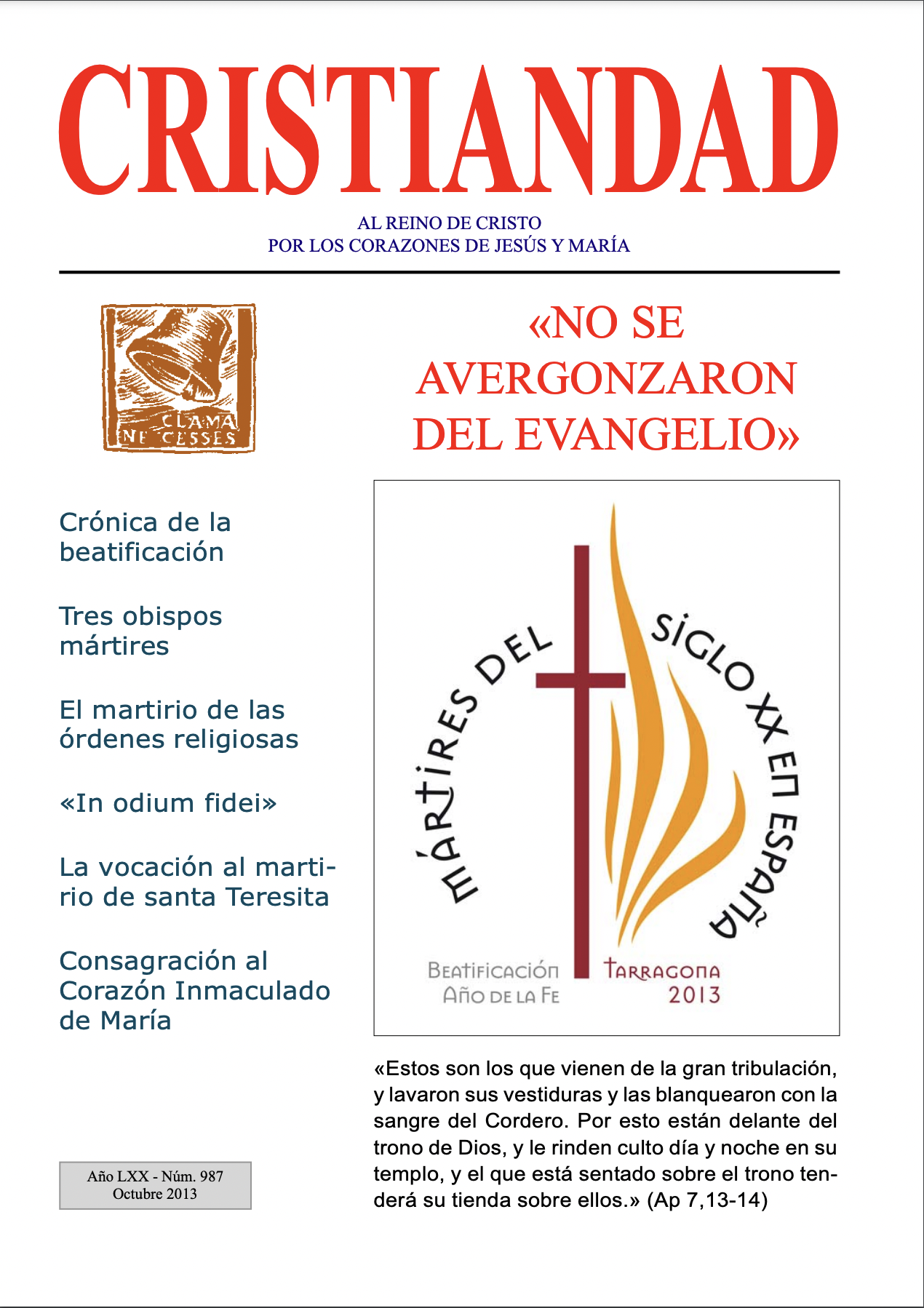 EL pasado 13 de octubre tuvo lugar en Tarragona el acto más solemne y de mayor resonancia eclesial con el que la Iglesia en España ha podido celebrar el Año de la Fe. Nos referimos a la beatificación de los 522 mártires españoles que dieron su vida en testimonio de su fe durante la persecución que sufrió la Iglesia en España durante la guerra de 1936. Aún están vivas en el recuerdo las dos anteriores celebradas en Roma, también muy numerosas, las de los años 2001 y 2007, cuando fueron beatificados 233 y 498 mártires respectivamente. Junto con las restantes beatificaciones ya son 1523 los mártires españoles del siglo XX que han sido elevados a los altares, once de ellos ya canonizados. Este es el gran tesoro y la gran lección que la Iglesia nos ofrece para seguir fieles a los ejemplos que ellos nos dieron.
