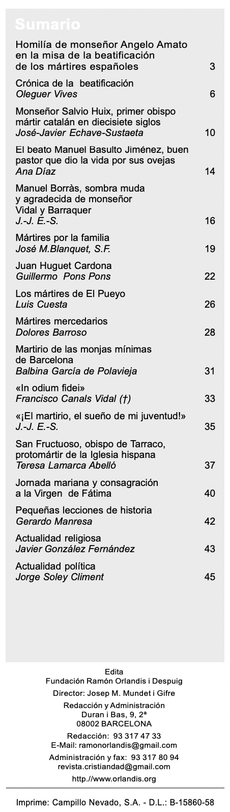 Al dedicar nuestras páginas a glosar la vida de los tres obispos beatificados y de diversos grupos de religiosos y sacerdotes, además de querer con ello sumarnos con gozo y agradecimiento al homenaje que justamente merecen, invitamos a nuestro lectores a admirar una vez más el testimonio de amor a Dios que dieron con su vida y con su heroica muerte. En unas circunstancias de especial manifestación de odio y crueldad dieron tales muestras de santidad que se les puede aplicar las palabras evangélicas «aprended de ellos que fueron mansos y humildes de corazón». Como dijo el cardenal Amato en la homilía de la misa de beatificación: «A la atrocidad de los perseguidores no respondieron con la rebelión o con las armas, sino con la mansedumbre de los fuertes».
