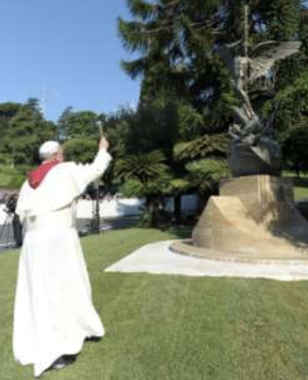 Papa Francisco bendice la estatua a San Miguel Arcángel en los jardines vaticanos.