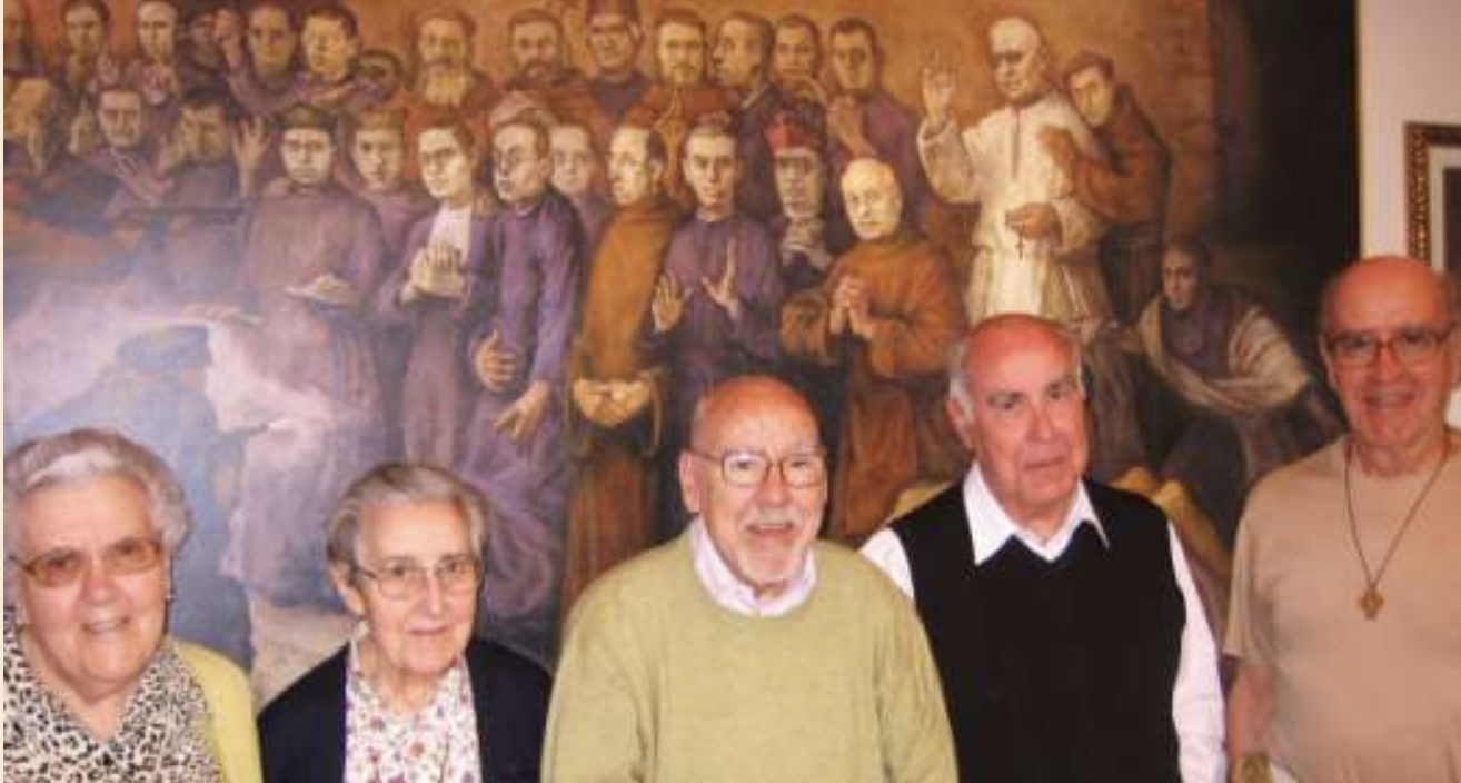 Cinco de los hermanos Tort en la sede de Hispania Martyr ante el cuadro en que en la tercera fila, segundo y tercero a la derecha del Obispo de Barcelona, figuran su padre AntonioTort y su tío Francisco Tort, siervos de Dios martirizados en Montcada el 3 de diciembre de 1936 por amparar en su casa al Obispo mártir de Barcelona Mons. Manuel Irurita.