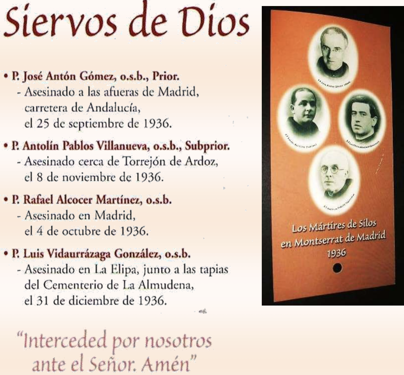 El reconocido martiriólogo Rvdo. Jorge López Teulón en su blog Victor in Vinculis en Religión en Libertad, escribía el 4 octubre 2011: “Cuatro monjes, residentes en el priorato silense de Madrid fueron asesinados entre septiembre de 1936 y enero de 1937. Fueron ejecutados en fechas distintas y enterrados en lugares diversos, pero los cuatro coinciden en que su muerte se debió exclusivamente a su condición de monjes. El móvil de su fusilamiento fue el “odium fidei” que se desató en España por aquellas infaustas calendas. Los restos de los cuatro monjes se conservan en la “sacristía de los Mártires”, en la iglesia de Montserrat de la calle san Bernardo de Madrid.