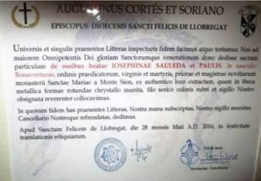 El 28 del pasado mayo el Sr. Obispo de San Feliu de Llobregat, Mons. Agustín Cortés presidió la ceremonia de extracción y traslado de la reliquia de la Beata Josefina Sauleda Paulís OP. Virgen y Mártir desde su sepulcro en el actual Monasterio de Monte-Sión en Esplugas de Llobregat a la parroquia de San Raimundo de Peñafort de Barcelona, que fue su monasterio hasta 1936 y del que había sido Priora y Maestra de novicias, para que desde ahora pueda ser invocada como intercesora y venerada en su reliquia bajo su nueva imagen.