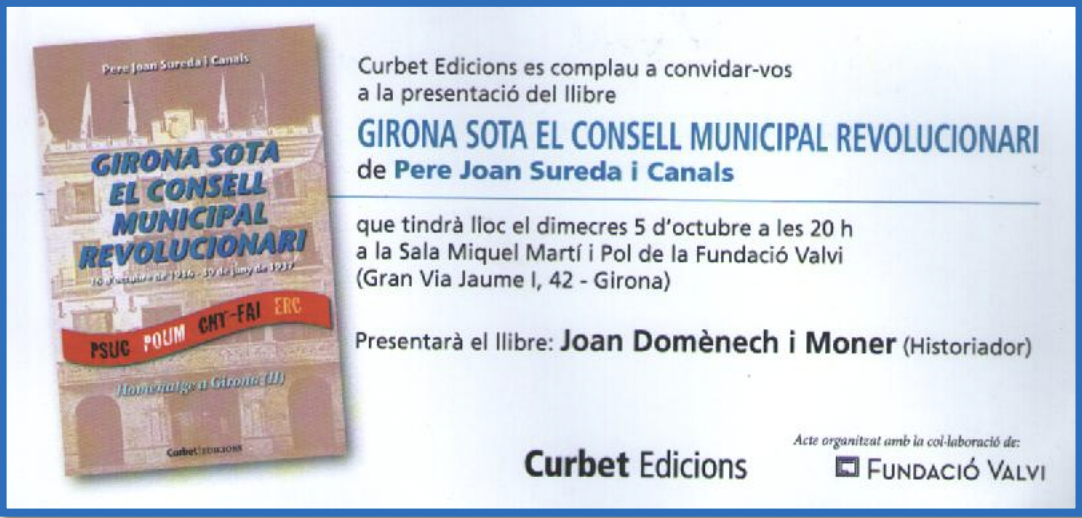 El gerundense Doctor Ingeniero Don Pedro Sureda Canals, publicó hace tres años “Girona sota els comités. Homenatge a Girona. (“Gerona bajo los Comités. Homenaje a Gerona”), imprescindible libro para quienes quieran conocer la sobrecogedora realidad del día a día en el trascurrir de los tres primeros meses de revolución y terror del verano de 1936 en la provincia de Gerona, con el reguero de asesinatos de gerundenses marcados como «enemigos» o «fascistas», por ser clérigos, propietarios, empresarios, votantes de derechas o creyentes, entre ellos el padre del autor.