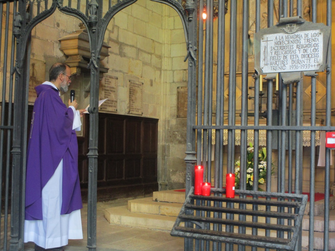 Mosén Antonio Gómez Mir el pasado 3 de diciembre, aniversario del martirio del S.d.D. Mons. Manuel IruritaAlmandoz, en la capilla erigida en el claustro de la Catedral de Barcelona en memoria de los 930 sacerdotes, religiosos y religiosas martirizados en esta diócesis.